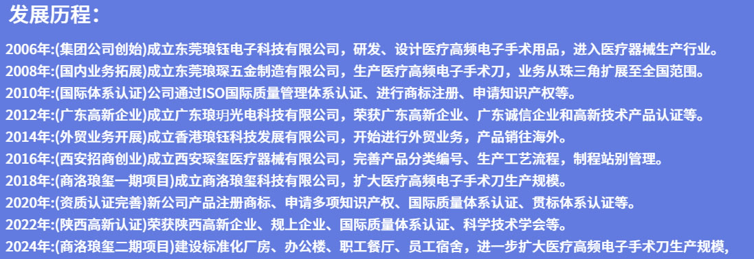 公司在原有的基礎(chǔ)上成立了東莞市瑯琛電子五金有限公司和香港瑯鈺科技發(fā)展有限公司,專業(yè)生產(chǎn)經(jīng)營(yíng)醫(yī)療高頻電子手術(shù)用品:醫(yī)用手術(shù)刀、高頻電極、消融電極、高頻電刀、高頻利普刀、微創(chuàng)手術(shù)刀、雙極電凝鑷、雙極電凝鉗等。我們對(duì)于醫(yī)療高頻電子手術(shù)用品的精密配件加工,以及半成品和成品的生產(chǎn)已經(jīng)形成了完整配套的設(shè)施:產(chǎn)品研發(fā)生產(chǎn)、五金數(shù)控機(jī)加、精密五金制造、配件表面處理、塑膠成型加工、產(chǎn)品裝配包裝、模具設(shè)計(jì)制造的生產(chǎn)單位和管理團(tuán)隊(duì)等。
